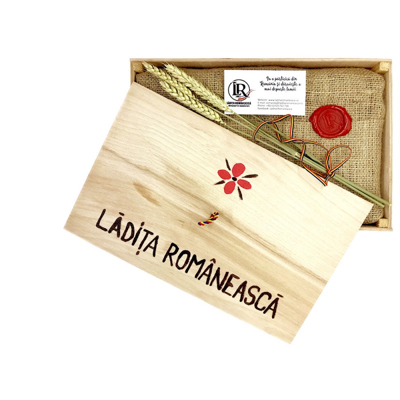 Wrapping:plywood, jute cloth, wooden wool, wheat ears, tricolor cord, wax seal, packthread, handwritten business card with information about Romania and famous Romanians.